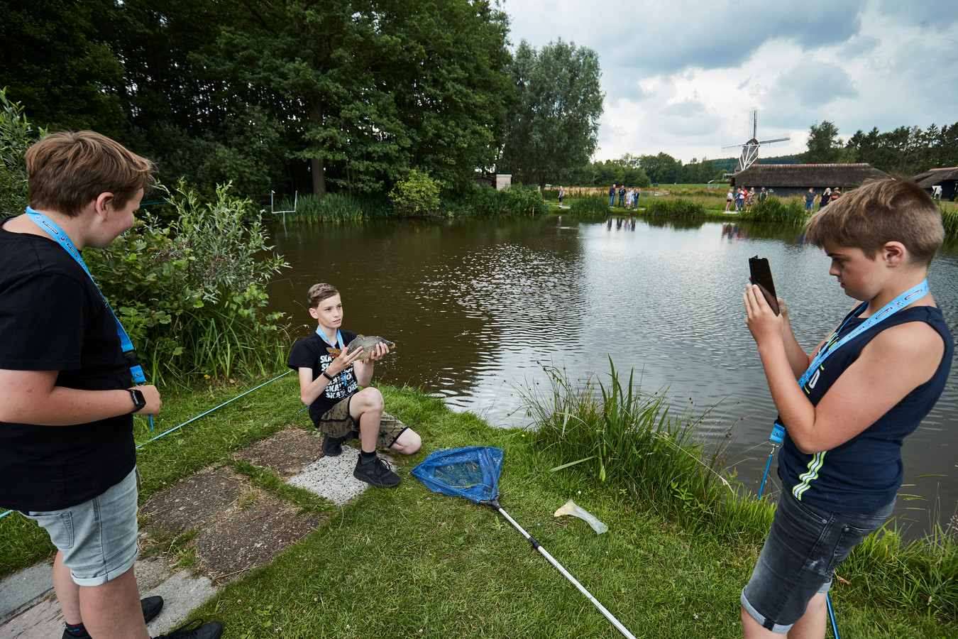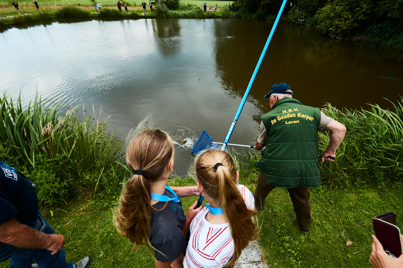 En ja hoor, weer beet. Een medewerker van visclub HSV Laren-Lochem helpt twee jongedames om hun vangst binnen te halen. © Arjan Gotink