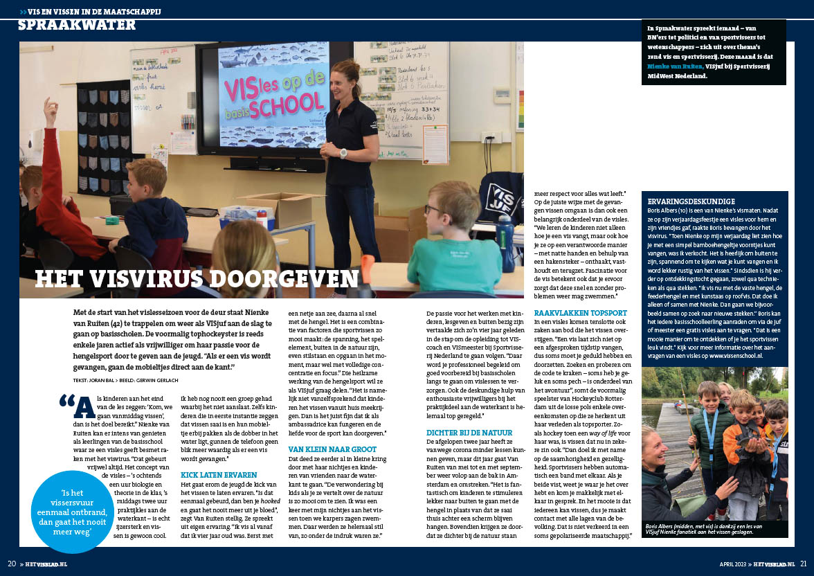 “Als kinderen aan het eind van de les zeggen: ‘Kom, we gaan vanmiddag vissen’, dan is het doel bereikt.” Nienke van Ruiten kan er intens van genieten als leerlingen van de basisschool waar ze een visles geeft besmet raken met het visvirus. “Dat gebeurt vrijwel altijd. Het concept van de visles – ’s ochtends een uur biologie en theorie in de klas, ’s middags twee uur praktijkles aan de waterkant – is ijzersterk en vissen is gewoon cool. Ik heb nog nooit een groep gehad waarbij het niet aanslaat. Zelfs kinderen die in eerste instantie zeggen dat vissen saai is en hun mobieltje erbij pakken als de dobber in het water ligt, gunnen de telefoon geen blik meer waardig als er een vis wordt gevangen.”