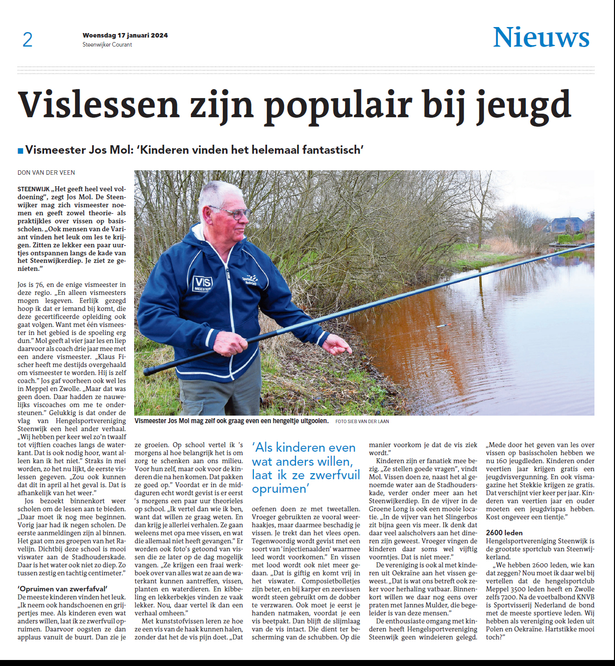 Hengelsportvereniging Steenwijk geen windeieren gelegd. “Mede door het geven van les over vissen op basisscholen hebben we nu 160 jeugdleden. Kinderen tot veertien jaar krijgen gratis een jeugdvisvergunning en het Stekkie Magazine, dat vier keer per jaar verschijnt. De vereniging is ook al met kinderen uit Oekraïne aan het vissen geweest, dat is wat ons betreft ook zeker voor herhaling vatbaar.” HSV Steenwijk is met 2600 leden de grootste sportclub van Steenwijkerland. “Wij hebben als vereniging ook leden uit Polen en Oekraïne”, zegt Jos. “Hartstikke mooi toch?”